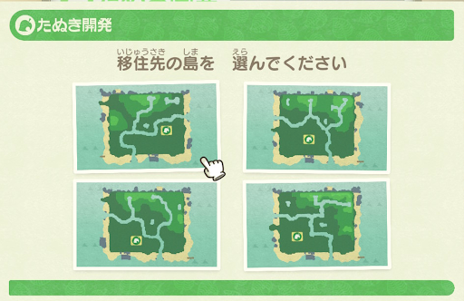 게임을 시작하면 타누키 개발 카운터에서 설명받고 자신의 이름, 북반구나 남반구, 생일을 설정한 후 지형의 지도를 4종류 보여준다. 섬의 지형에는 여러 종류가 있지만, 랜덤하게 선택된 4종류 중에서 밖에 선택할 수 없다.