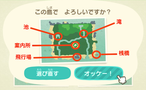 섬의 지형 선택은 리세마라 요소가 되어 있어 나중에 변경할 수 없을 가능성이 높다. 플레이어는 표시되는 수 패턴 중에서 지형을 선택할 수 있지만, 지형의 종류 자체는 전부 30 이상 있는 것이 아닐까 예상. 표시된 패턴이 마음에 들지 않았던 경우는, 리세마라 해 다시 하는 것도 생각해 두자.
