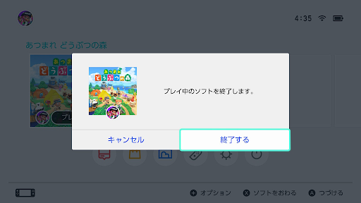 리세마라를 하는 경우는, Switch의 홈 버튼을 눌러 오른쪽 하단에 표시되는 「소프트를 마친다」를 탭한다. 「플레이중의 소프트를 종료합니다」라고 표시되므로, 「종료한다」를 선택해 1번 최초의 「타누키 개발」의 화면으로부터 다시 보자.